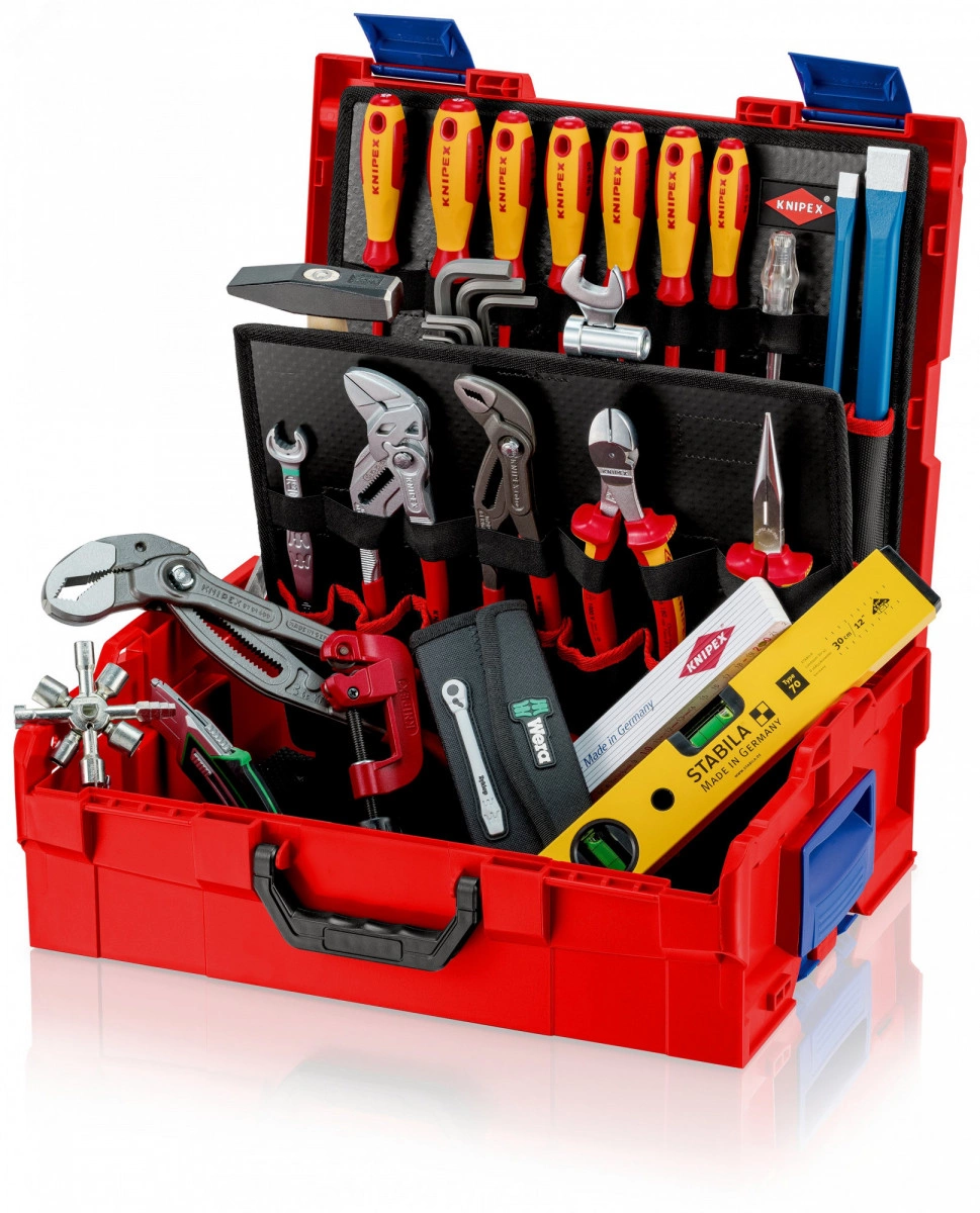 KNIPEX L-BOXX Сантехника прочный футляр из ударопрочного пластика ABS. Всего включает 52 фирменных инструмента. Макс. нагрузка - 25 кг. с защитой от брызг. продуманная система хранения - ящики надежно соединяются между собой. Оформление внутреннего пространства в разных вариантах. Ручка для переноски в интересах экономии места утапливается в углублении в крышке. ручки эргономичной формы и дополнительные боковые вставки для удобного обращения с инструментом. С двусоставной инструментальной панелью из двойного грязеотталкивающего полипропилена. панели для инструментов крепятся между собой на липучках. Верхняя часть с 10 карманами и 10 эластичными петлями. нижняя часть с 7 карманами на лицевой стороне и клапаном для подвешивания панели, который служит также для извлечения панели или её вертикального размещения в ящике KNIPEX L-BOXX. Донная часть с 7 карманами и 7 эластичными петлями.