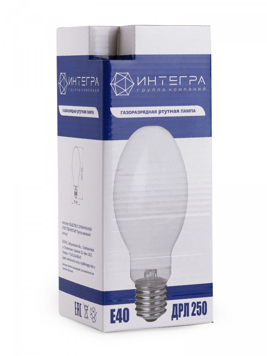 Ртутная лампа ИНТЕГРА универсального положения горения, предназначена для использования в открытых и закрытых светильниках для общего уличного, наружного и промышленного освещения, основание колбы резьбовое, исключено отслоение колбы от цоколя.