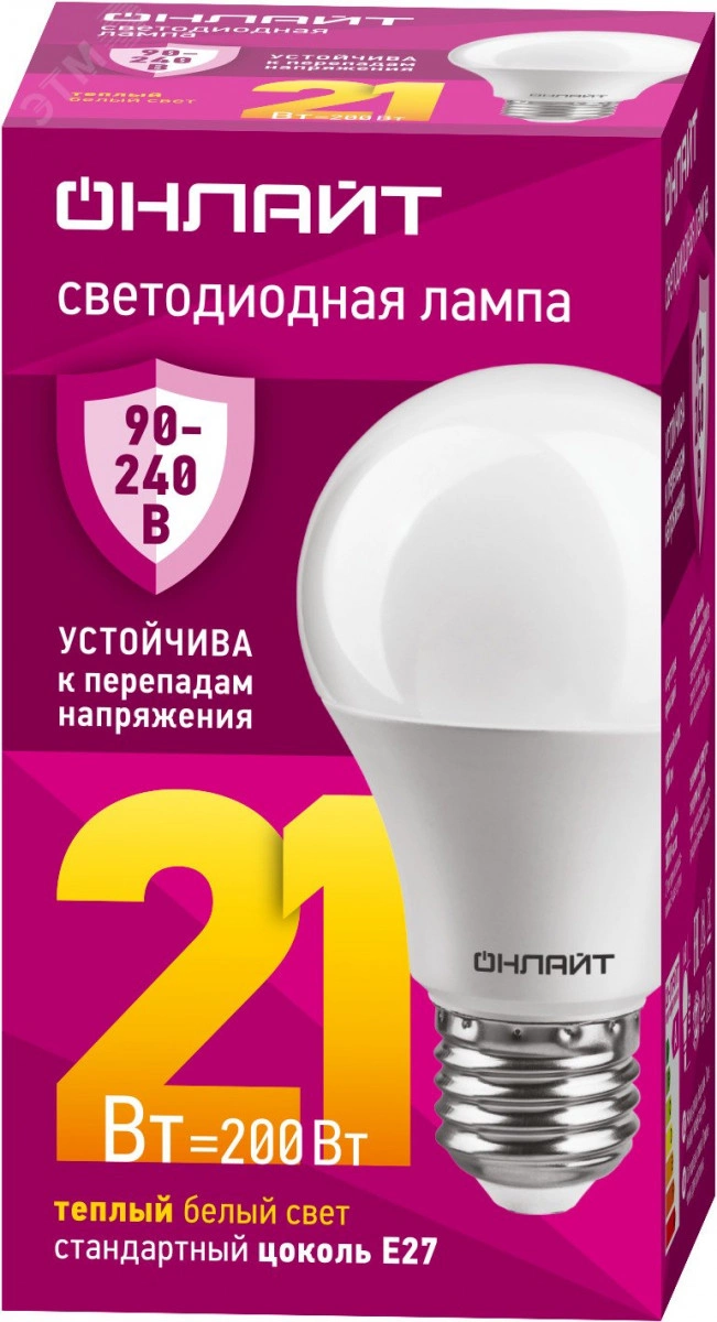Лампа светодиодная 21вт OLL-A60-21-230-2.7К-E27 PRO 90-240В ОНЛАЙТ