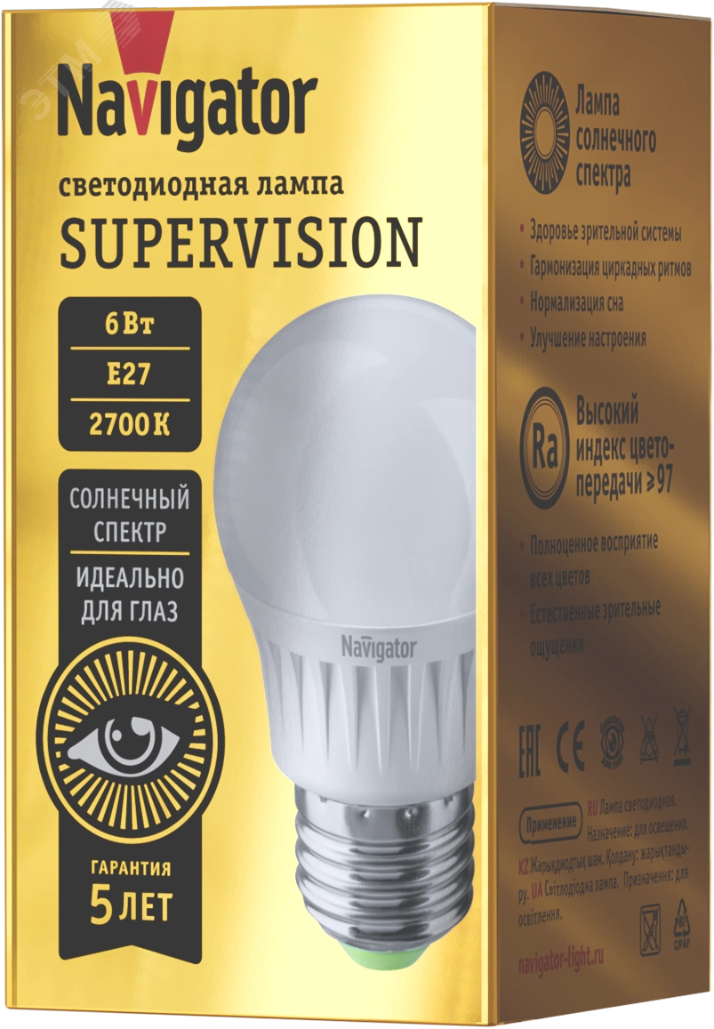 Navigator Supervision – светодиодные лампы нового поколения, в которых используются инновационные светодиоды Bridgelux Thrive (США) со спектром света, максимально приближенным к солнечному! Светодиодные лампы Navigator Supervision полностью безопасны для глаз и обеспечивают максимально комфортное освещение для работы и отдыха. Равномерный спектр света без пиков в области синего цвета и провалов в области сине-бирюзового и красного цветов гарантирует здоровье зрительной системы и гармонизацию биоритмов - улучшение качества сна и поддержку гормональной системы. Индекс цветопередачи ?97 обеспечивает физиологичные зрительные ощущения без дискомфорта и полноценное восприятие цветов и оттенков.