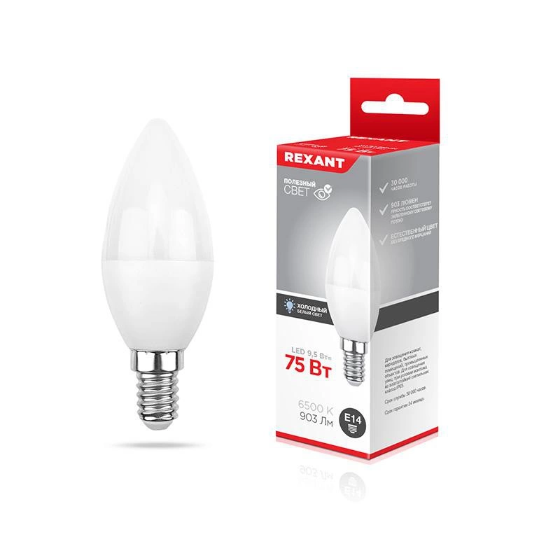 В нашем интернет-магазине вы можете купить Лампа светодиодная 9.5Вт CN свеча 6500К холод. бел. E14 903лм Rexant 604-203 в Екатеринбурге, артикул 604-203. Чтобы уточнить условия оплаты, доставки и действующие скидки на товар, свяжитесь с нашим менеджером по телефону +7 (343) 266-30-88.