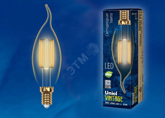Лампа светодиодная декоративная LED 5вт 220-250В свеча на ветру 420Лм Е14 2250К золотая колба Uniel Vintage