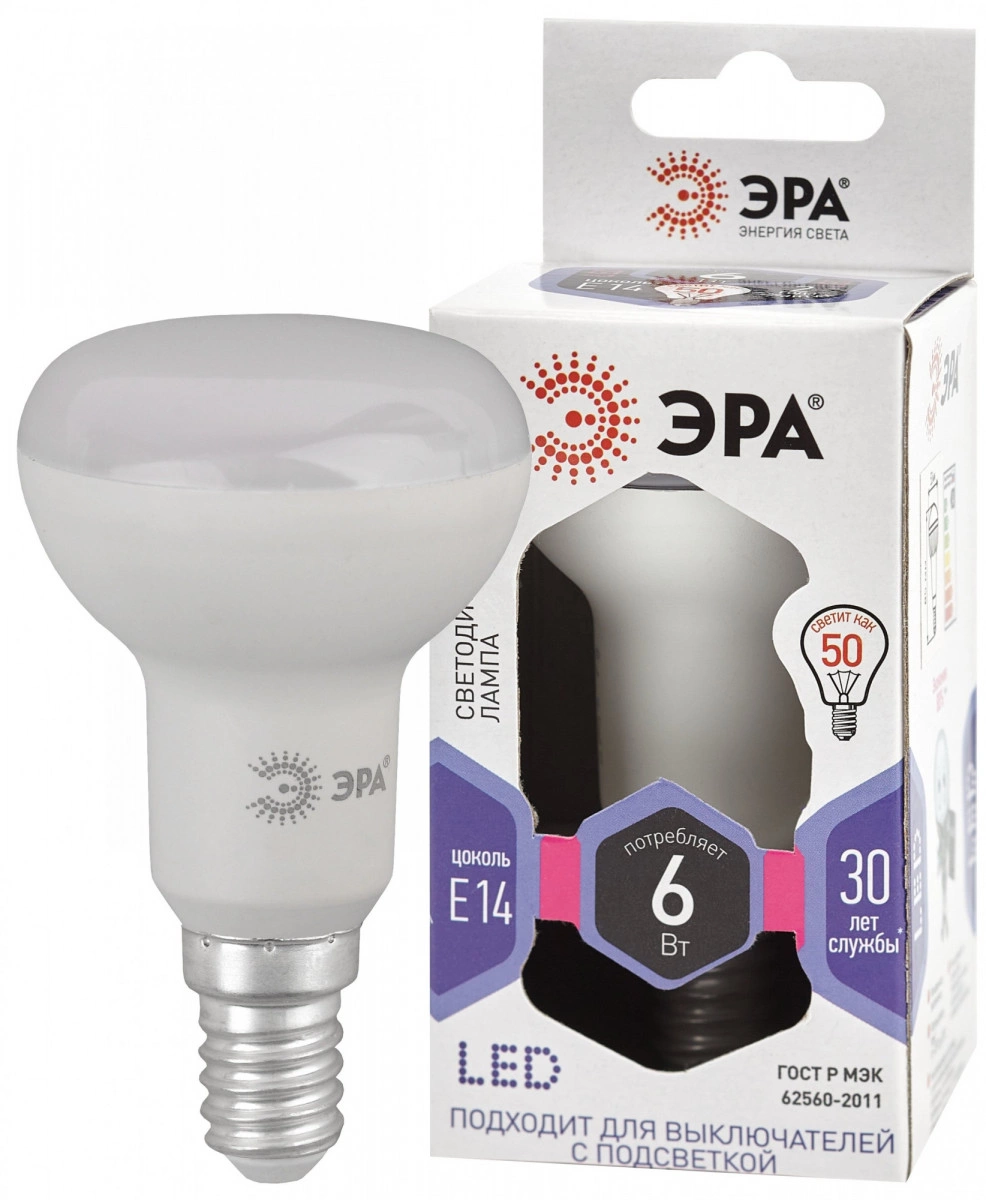 Лампа светодиодная Е14 6Вт рефлектор холодный дневной свет STD LED R50-6W-860-E14 Е14 / ЭРА