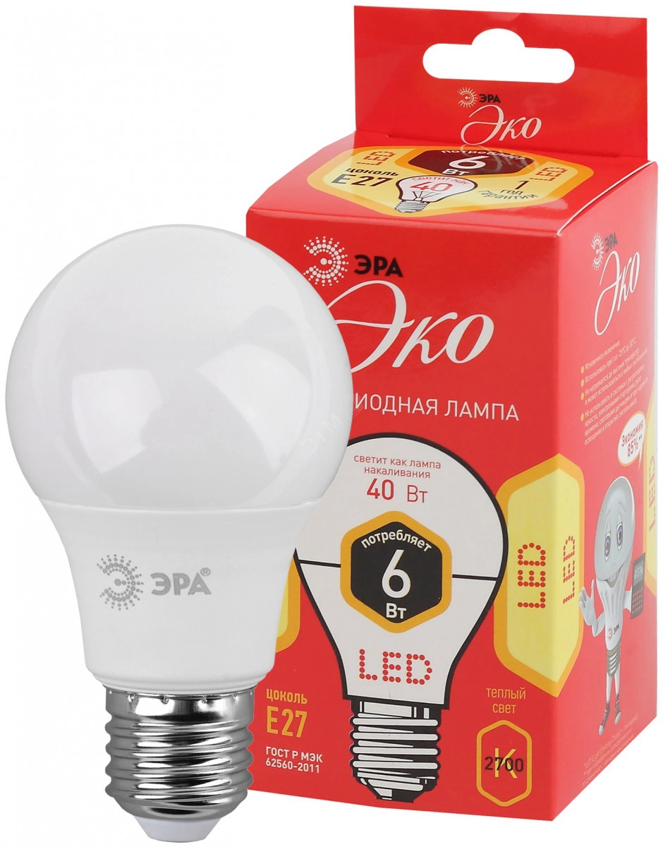 Лампа светодиодная ECO LED A60-6W-827-E27 (диод, груша, 6Вт, тепл, E27), (10/100/1200) ЭРА
