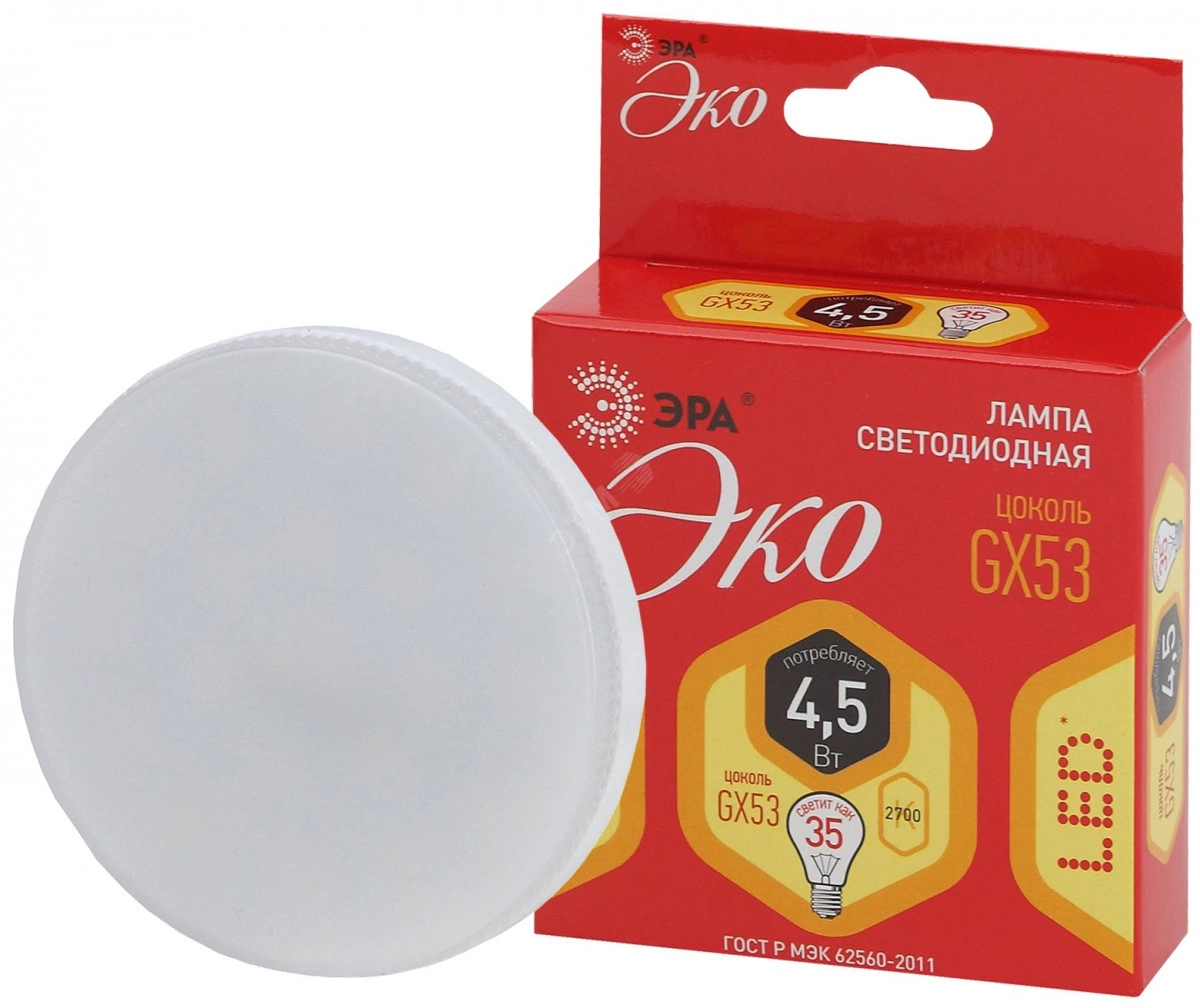 Лампа светодиодная ECO LED GX-4,5W-827-GX53 (диод, таблетка, 4,5Вт, тепл, GX53 (10/100/4800) ЭРА