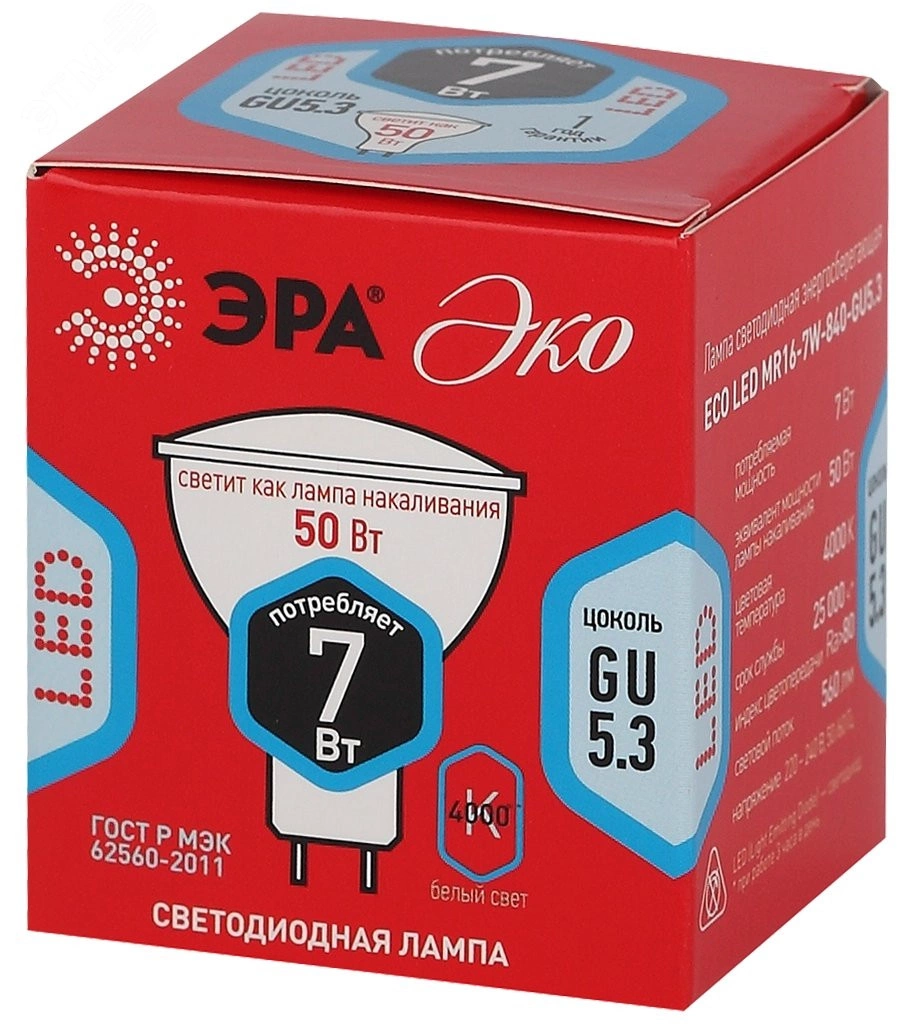 Лампа светодиодная ECO LED MR16-7W-840-GU5.3 (диод, софит, 7Вт, нейтр, GU5.3) ЭРА (10/100/4000) ЭРА