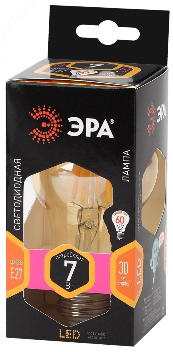 Лампа светодиодная филаментная F-LED A60-7W-827-E27 gold (филамент, груша золот., 7Вт, тепл, Е27) ЭРА (10/100/1200) ЭРА