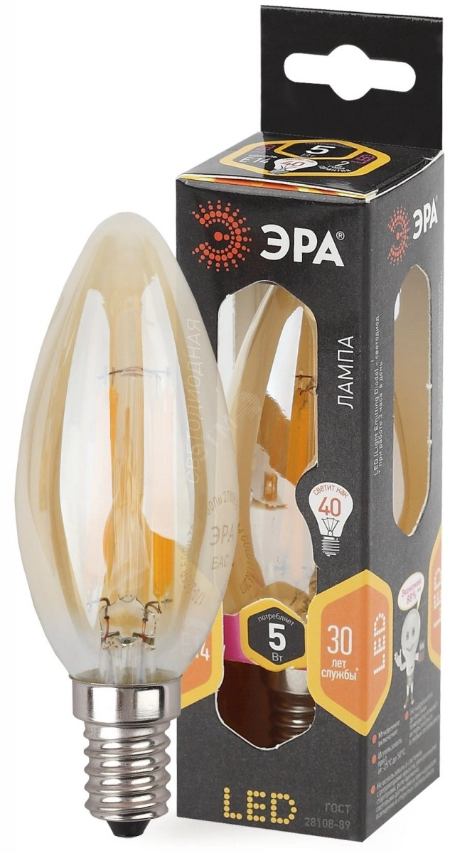 Лампа светодиодная филаментная F-LED B35-5W-827-E14 gold (филамент, свеча золот., 5Вт, тепл, E14 (10/100/2800) ЭРА