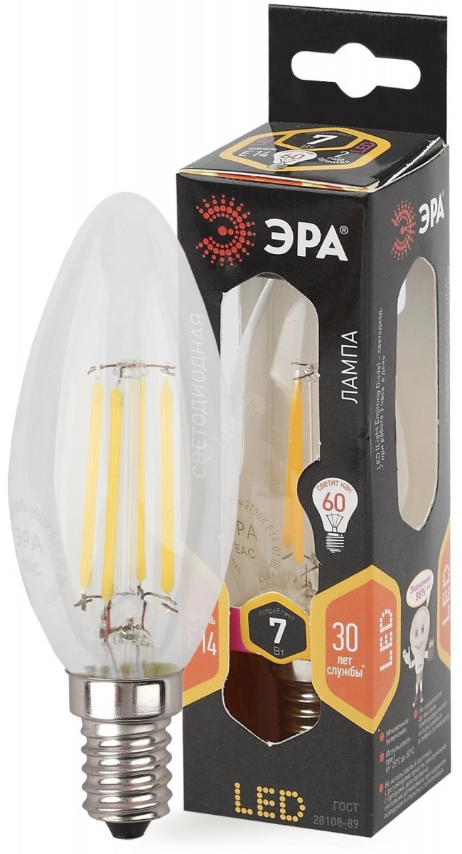 Лампа светодиодная филаментная F-LED B35-7W-827-E14 (филамент, свеча, 7Вт, тепл, E14 (10/100/2800) ЭРА