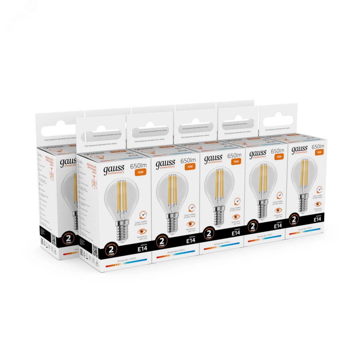 Лампа светодиодная филаментная LED 10 Вт 650 лм 2700К AC190-240В E14 шар P45 теплая Elementary Gauss