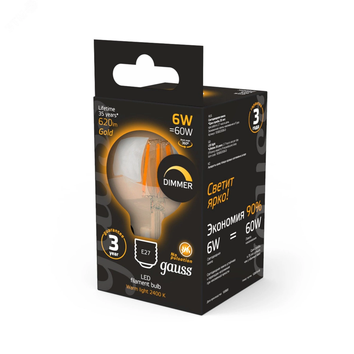 Лампа светодиодная филаментная LED 6 Вт 620 лм 2400К AC185-265В E27 шар G95 теплая золотистая колба диммируемая Black Filament Gauss