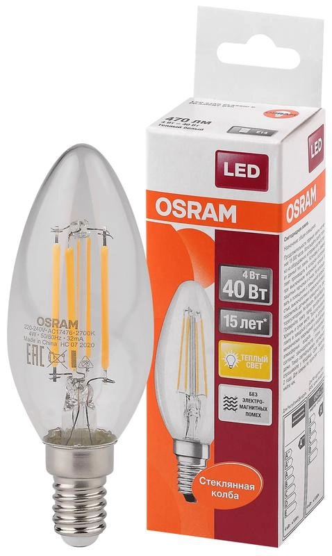 Лампа светодиодная филаментная OSRAM LEDSCLB40 4W/827 230V FIL E14 FS1 OSRAM, 470 лм, 4Вт (замена 40Вт), 2700К (теплый белый свет). Цоколь E14, колба B. Исполнение колбы прозрачное, стекло. Напряжение питания 220-240В. Товар сертифицирован.