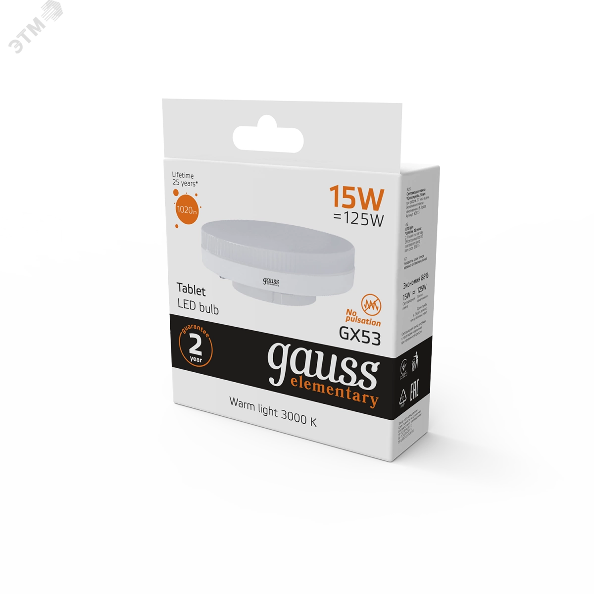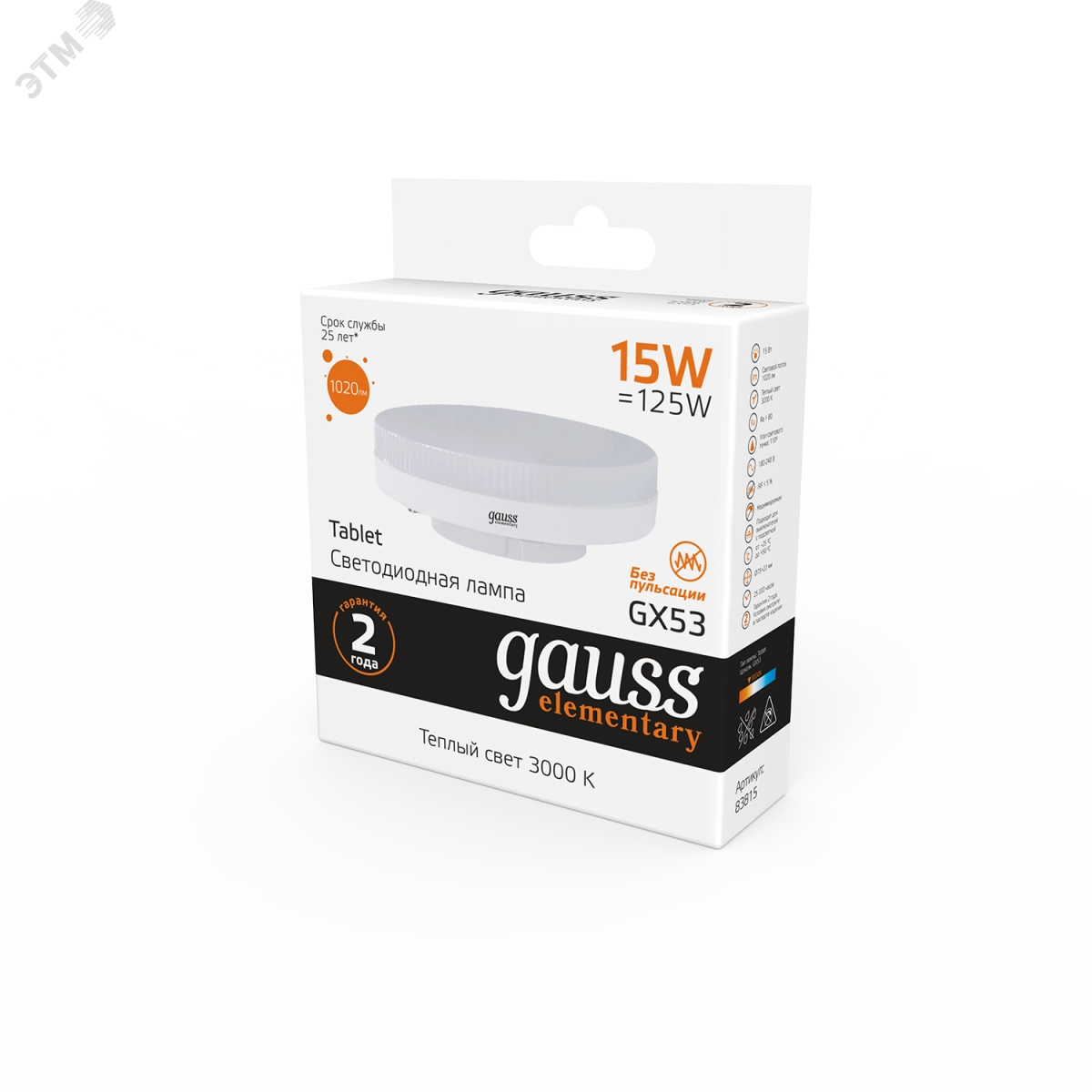 Лампа светодиодная LED 15 Вт 1020 Лм 3000К теплая GX53 таблетка Elementary Gauss