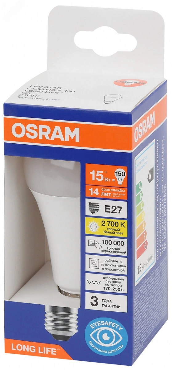 Светодиодные лампы OSRAM LONG LIFE - разумная замена галогенным и традиционным лампам накаливания. Специальная серия OSRAM LONG LIFE снижает затраты на освещение до 90%, сохраненяя привычный и комфортный уровень освещенности. В целях безопасности и с заботой о здоровье потребителей, при производстве не используются вредные вещества согласно материалам европейского стандарта RoHS. Приобретая лампы OSRAM LONG LIFE, вы получаете качество света на высоте - низкие пульсации защищают глаза, высокий индекс цветопередачи позволяет видеть мир в его истинном цвете, отсутствие вредных электромагнитных излучений, что подтверждено сертификатом ЭМС, долгий срок службы в 40 000 часов, 3 года гарантии производителя.