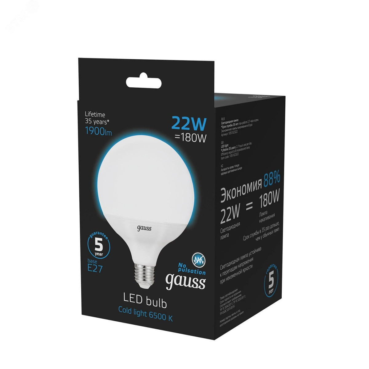 Премиальная серия ламп Gauss Black — надежные источники освещения высокого качества. Благодаря использованию качественных комплектующих и современных технологий лампы этой серии имеют один из самых высоких показателей энергоэффективности и долговечности. Уровень пульсации светового потока в светодиодных лампах Gauss ниже 5%, поэтому они создают комфортный и безопасный свет. Покупатель ламп серии black может быть уверен, что получает безопасный для глаз, яркий и комфортный свет. Передовые технологические решения обеспечивают стабильный световой поток даже при перепадах напряжения. Длительный срок гарантии — решение, основанное на уверенности в качестве продукции и ее долговечности.