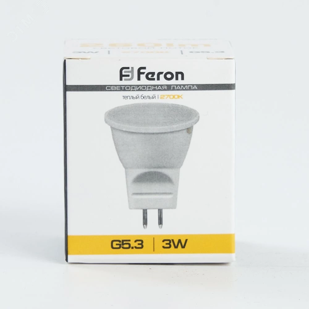 Светодиодная лампа Feron LB-271 изготовлена по новейшим технологиям на высококачественном оборудовании с применением полностью автоматической сборки. Корпус лампы выполнен из алюмопласта – это наиболее перспективная технология охлаждения светодиодов, которая обеспечивает максимальнонеобходимый теплоотвод, сохраняет эстетику и экономически выгодна по цене. Современная стильная упаковка выгодно смотрится на полке, а цветовое деление по температуре свечения и четкие яркие обозначения важнейших параметров позволят покупателям с легкостью ориентироваться в ассортименте. Лампа обладает высоким световым потоком 260Lm/270Lm/280Lm при мощности 3W и заменяет галогенную лампу типа MR11 мощностью 30W. Матовое стекло позволяет получить мягкий рассеянный свет, при этом яркость остается гарантированно высокой. Лампа предназначена для применения во встраиваемых светильниках и других осветительных приборах с цоколем G5.3 и рабочим напряжением 230V.