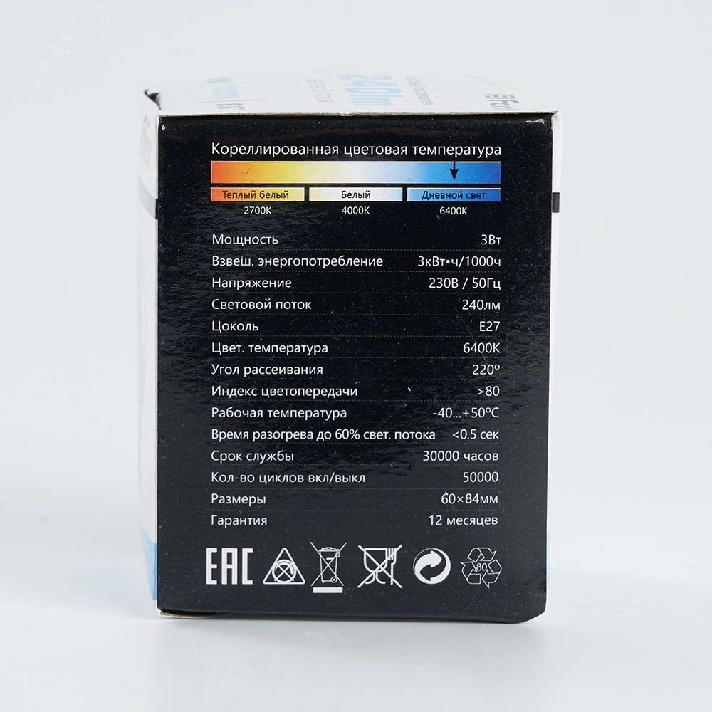 Лампа светодиодная LED 3вт Е27 6400K шар G60
