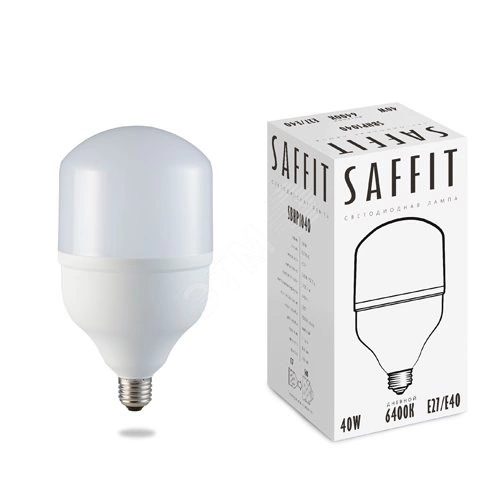 Лампа светодиодная SAFFIT SBHP1040, колба (промышленная), 40W 175-265V E27 4000К (белый), рассеиватель матовый белый, 3700Lm, угол рассеивания 220 градусов, 168х100мм. Лампы SAFFIT SBHP - светодиодные лампы высокой мощности широкого спектра применения с оптимальным ценовым предложением. Рекомендованы для внутреннего освещения торговых зон, складов, производственных помещений, наружного освещения хозяйственных и придомовых территорий.