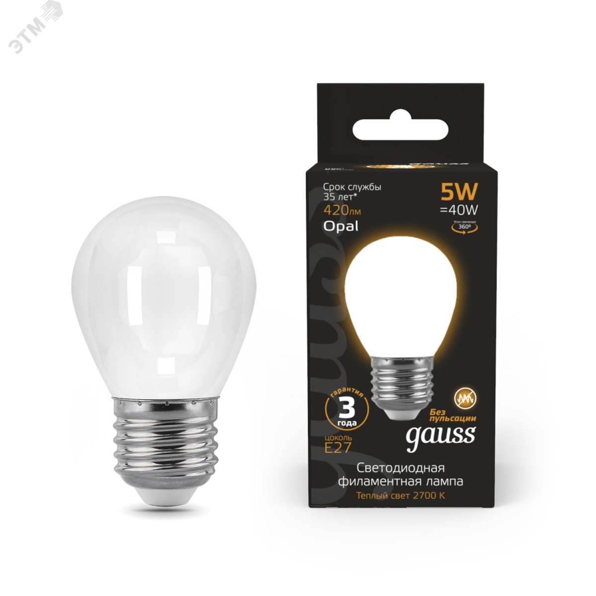 Лампа светодиодная LED 5 Вт 420 Лм 2700К теплая Е27 Шар milky Filament Gauss