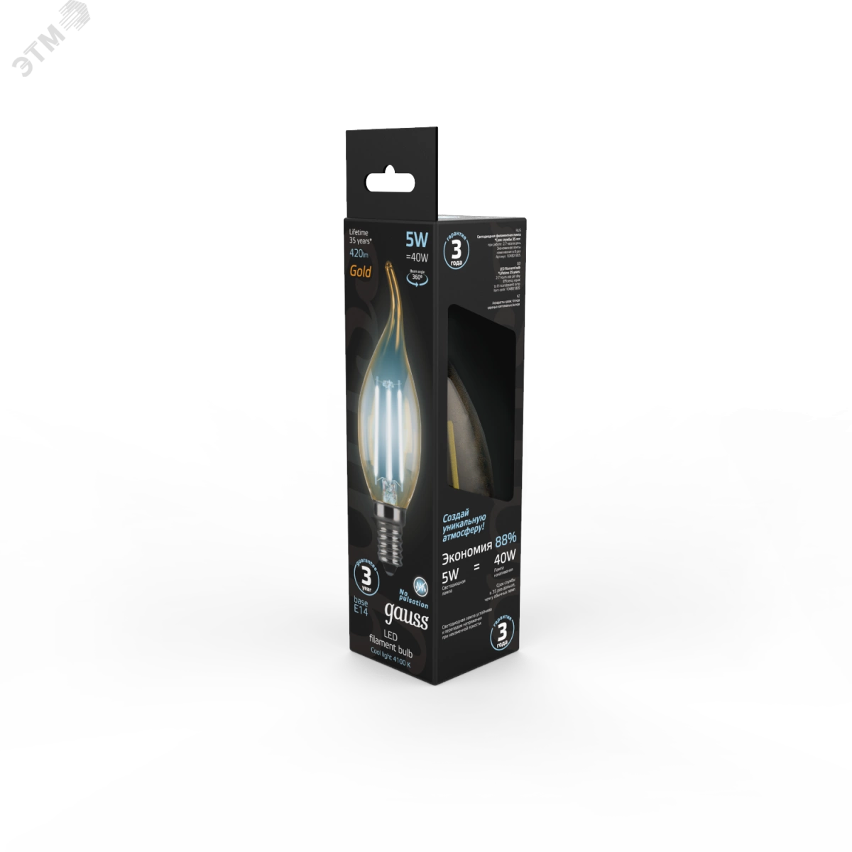 Лампа светодиодная LED 5 Вт 420 Лм 4100К белая Е14 Свеча на ветру golden Filament Gauss