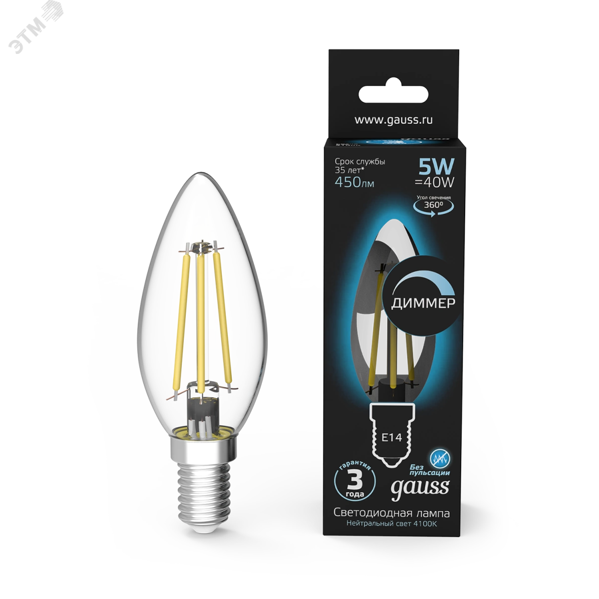 Лампа светодиодная LED 5 Вт 450 Лм 4100К белая Е14 Свеча диммируемая Filament Gauss