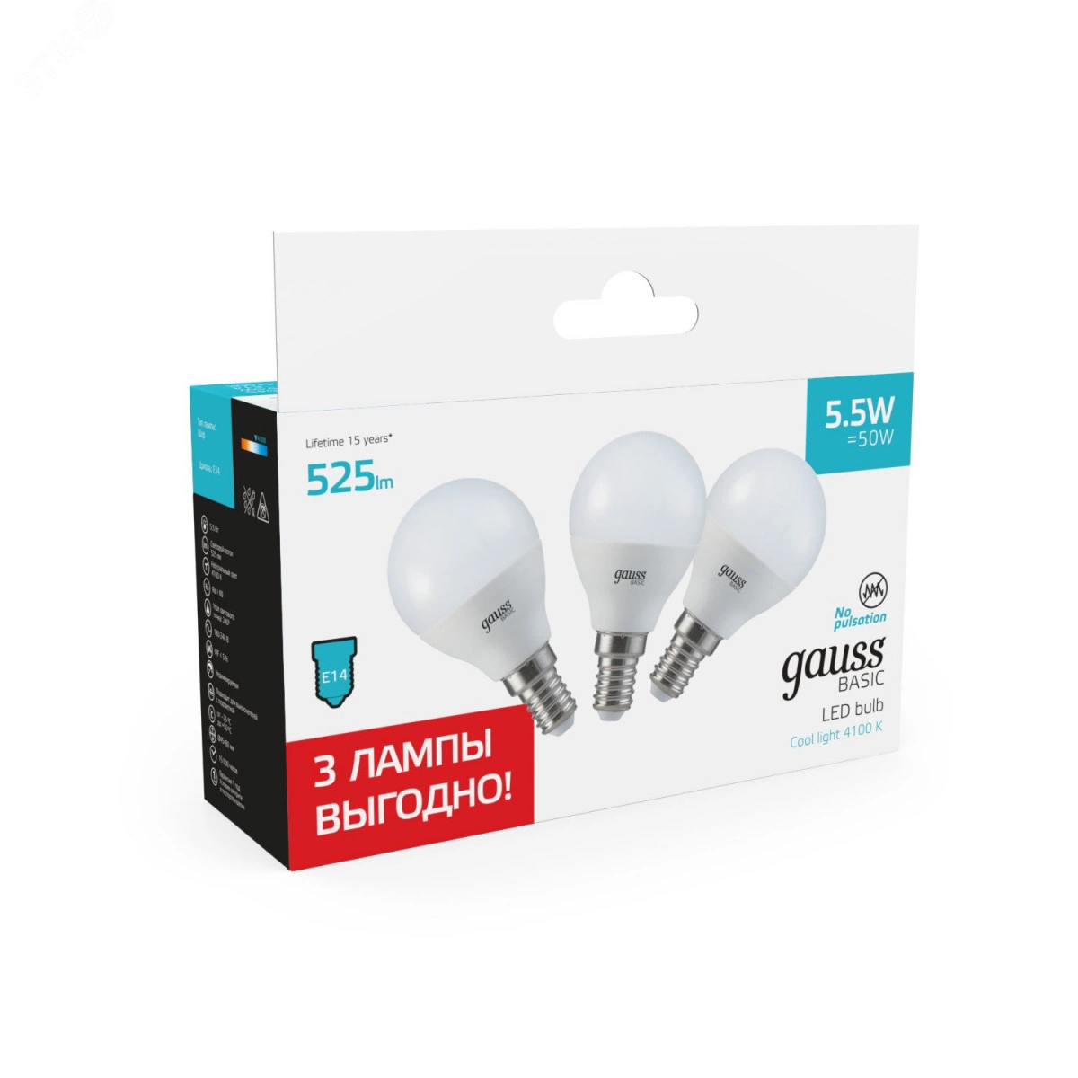Лампа светодиодная LED 5.5 Вт 525 лм 4100К AC180-240В E14 шар P45 нейтральный (промоупаковка 3 лампы) Basic Gauss