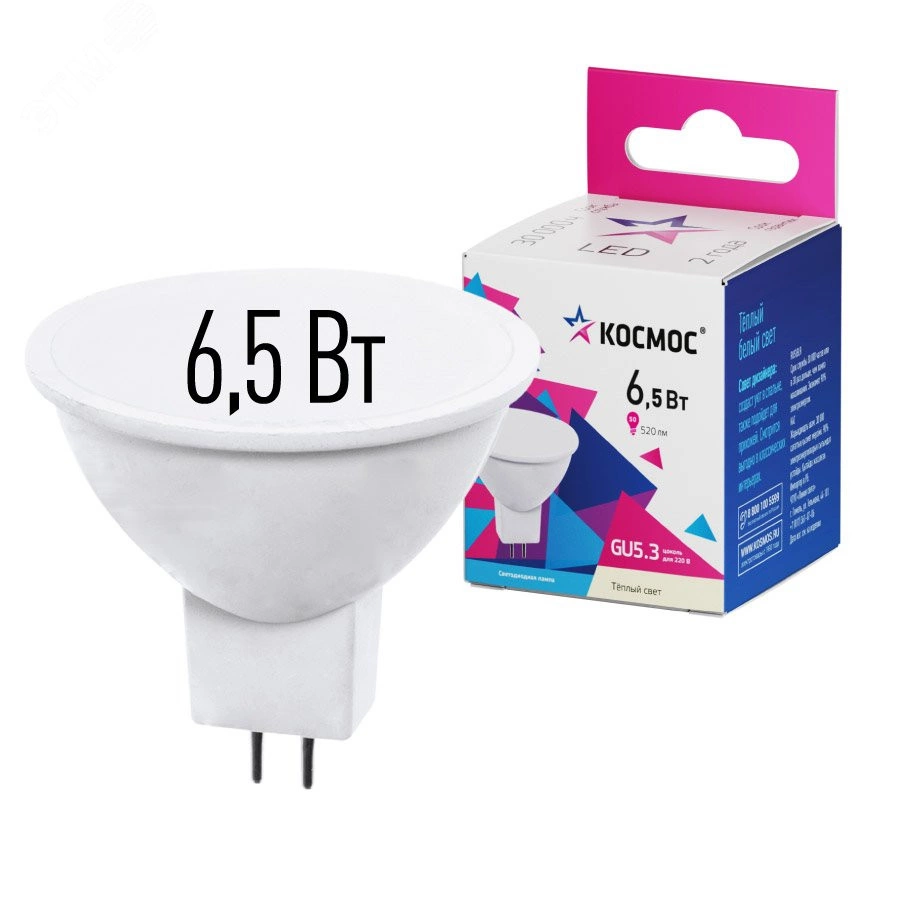 Светодиодная лампочка 6,5 Вт является аналогом галогенной лампы GU5.3. Аналог по мощности 50 Вт - для средней комнаты понадобится 5 таких лампочек. Стабильный свет без падения яркости в течение всего срока службы (30 000 часов) - за счет использования светодиодов известных производителей. Цвет свечения лампы - 3000 К теплый белый, идеально подойдет для спальни, и других зон, где требуется мягкий, расслабляющий свет. ''Здоровый'' свет без мерцания не утомляет глаза, а высокий индекс цветопередачи передает естественные цвета и оттенки.По размеру сопоставима с обычной галогенной лампочкой, но экономит до 80% энергии по сравнению с ней. Экологически безопасна и не требует утилизации. 2 года гарантии.