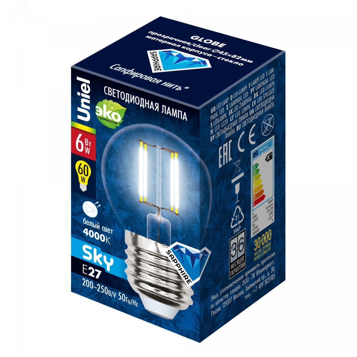 "Серия Sky — это серия светодиодных ламп с нитиевым излучателем, который обеспечивает очень ровное свечение лампы. Лампы серии Sky похожи на стандартные лампы накаливания и рекомендуются для общего освещения помещения, а также для использования в декоративных светильниках. Особенности строение лампы Sky -    1. Сапфировая подложка.    2. Люминофор.    3. Светодиоды. Светодиодные лампы серии Sky позволяют экономить до 90% электроэнергии по сравнению с обычными лампами накаливания, но при этом не теряя в качестве света. Так, например, лампа мощностью 7Вт заменит обычную лампу накаливания мощностью 60Вт. Лампа светодиодная LED-G45-6W/NW/E27/CL PLS02WH является аналогом 75 Вт лампы накаливания. Лампа имеет матовую колбу формы ""А"" и стандартный цоколь Е27. Цвет свечения - нейтральный белый. Упаковка - картон."