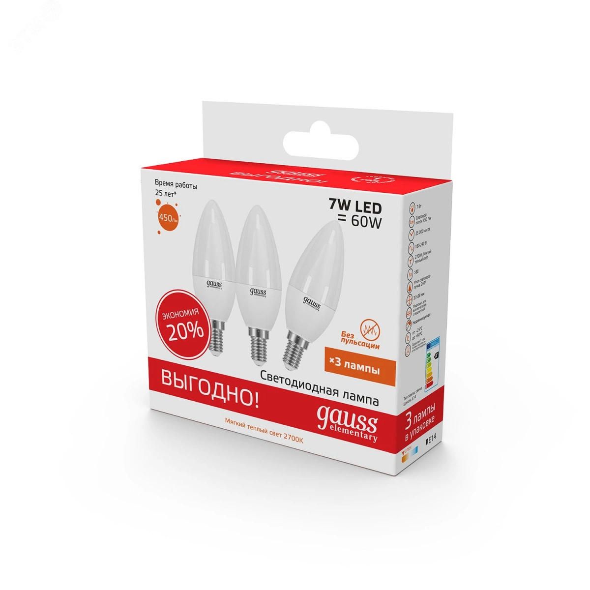 Лампа светодиодная LED 7 Вт 450 лм 3000К AC180-240В E14 свеча теплая (промоупаковка 3 лампы) Elementary Gauss
