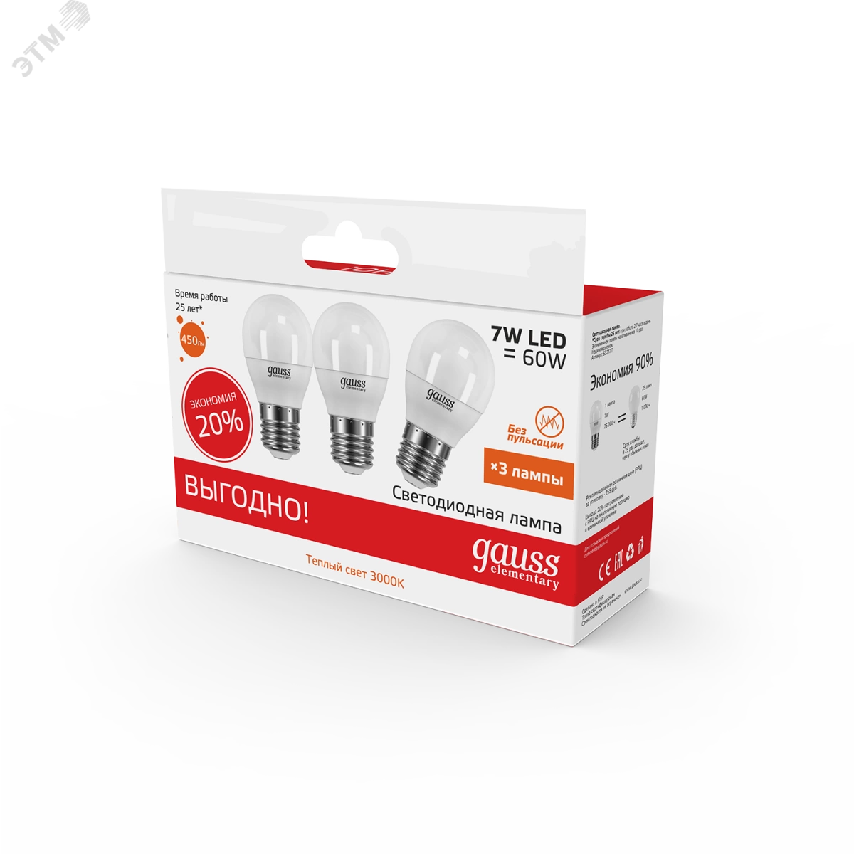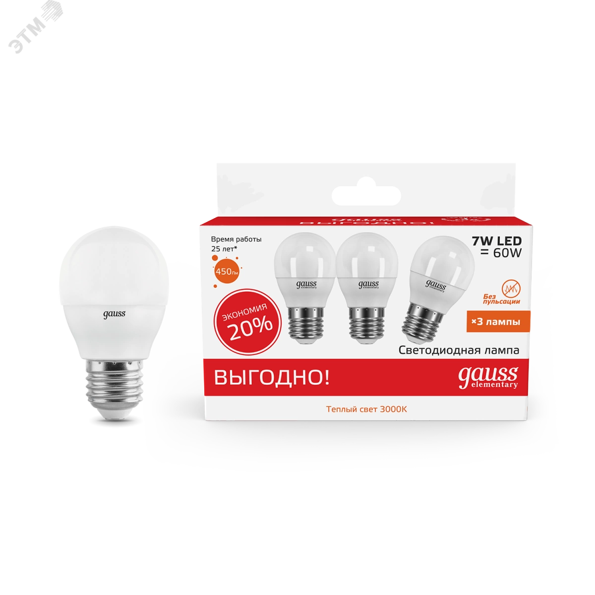 Лампа светодиодная LED 7 Вт 450 Лм 3000К теплая E27 Шар (3 лампы в упаковке) Elementary Gauss