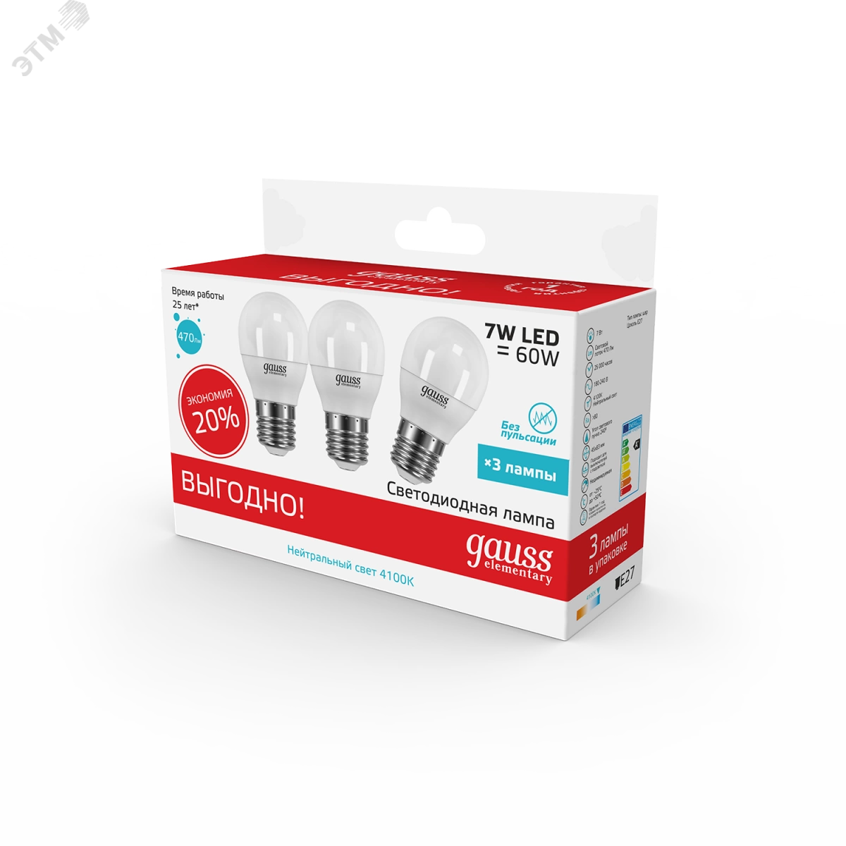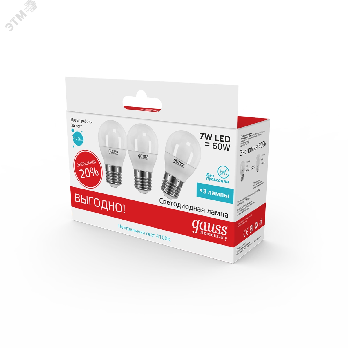Лампа светодиодная LED 7 Вт 470 Лм 4100К белая E27 Шар (3 лампы в упаковке) Elementary Gauss