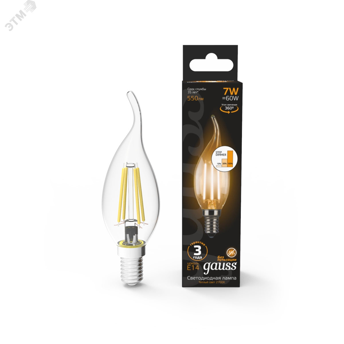 Лампа светодиодная LED 7 Вт 550 Лм 2700К теплая Е14 Свеча на ветру шаг. диммирование Filament Gauss