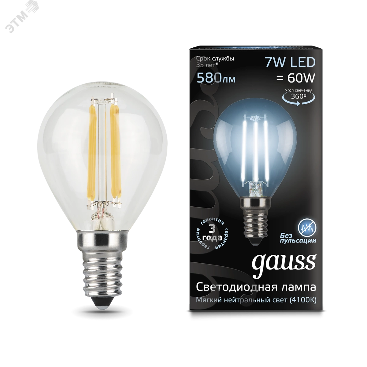 Лампа светодиодная LED 7 Вт 580 Лм 4100К белая Е14 Шар Filament Gauss