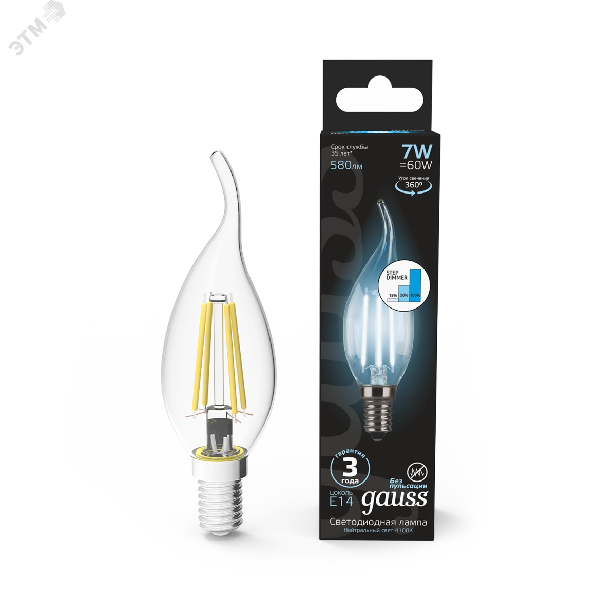 Лампа светодиодная LED 7 Вт 580 Лм 4100К белая Е14 Свеча на ветру шаг. диммирование Filament Gauss