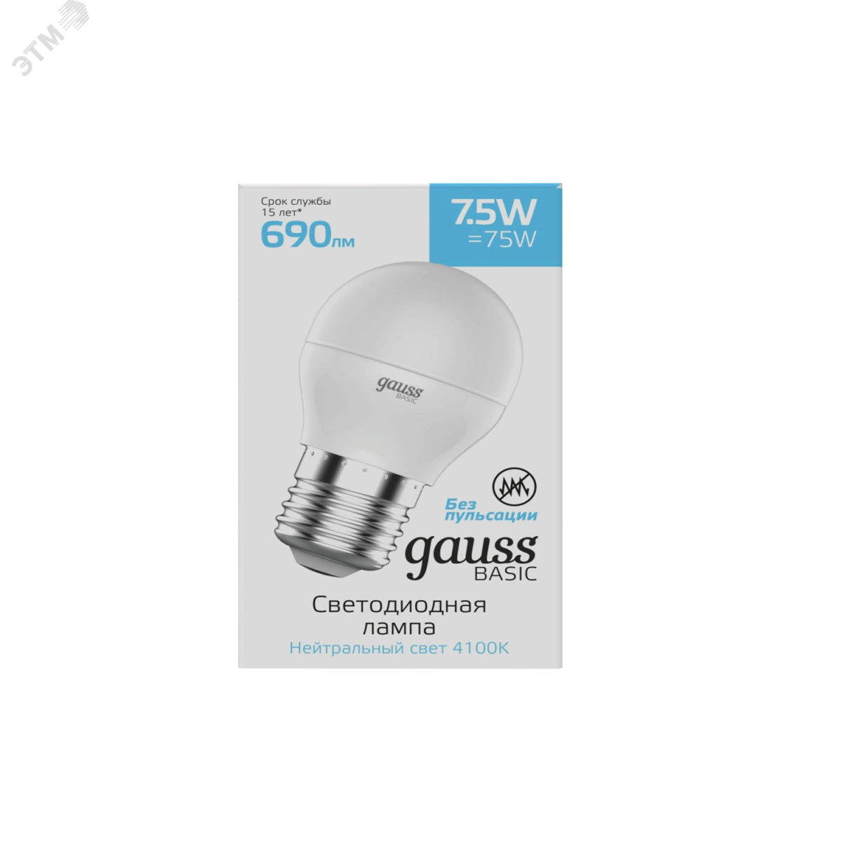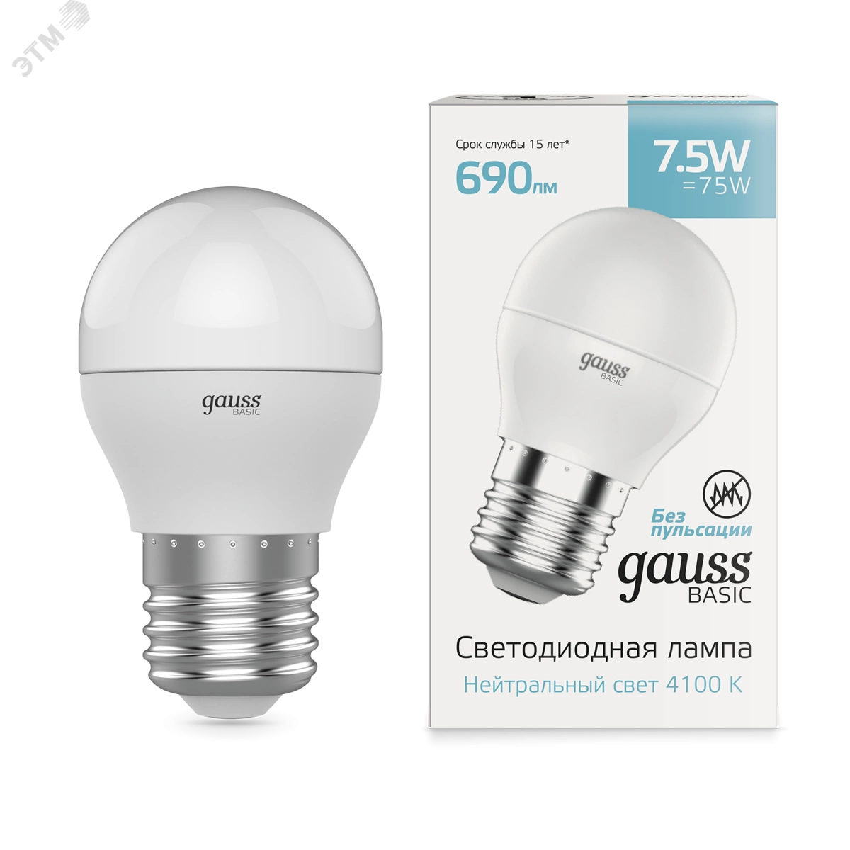 Лампа светодиодная LED 7.5 Вт690 Лм 4100К белая E27 Шар Basic Gauss