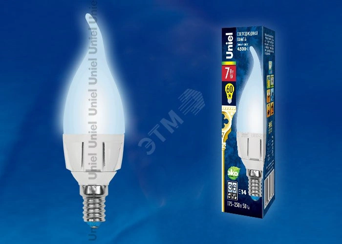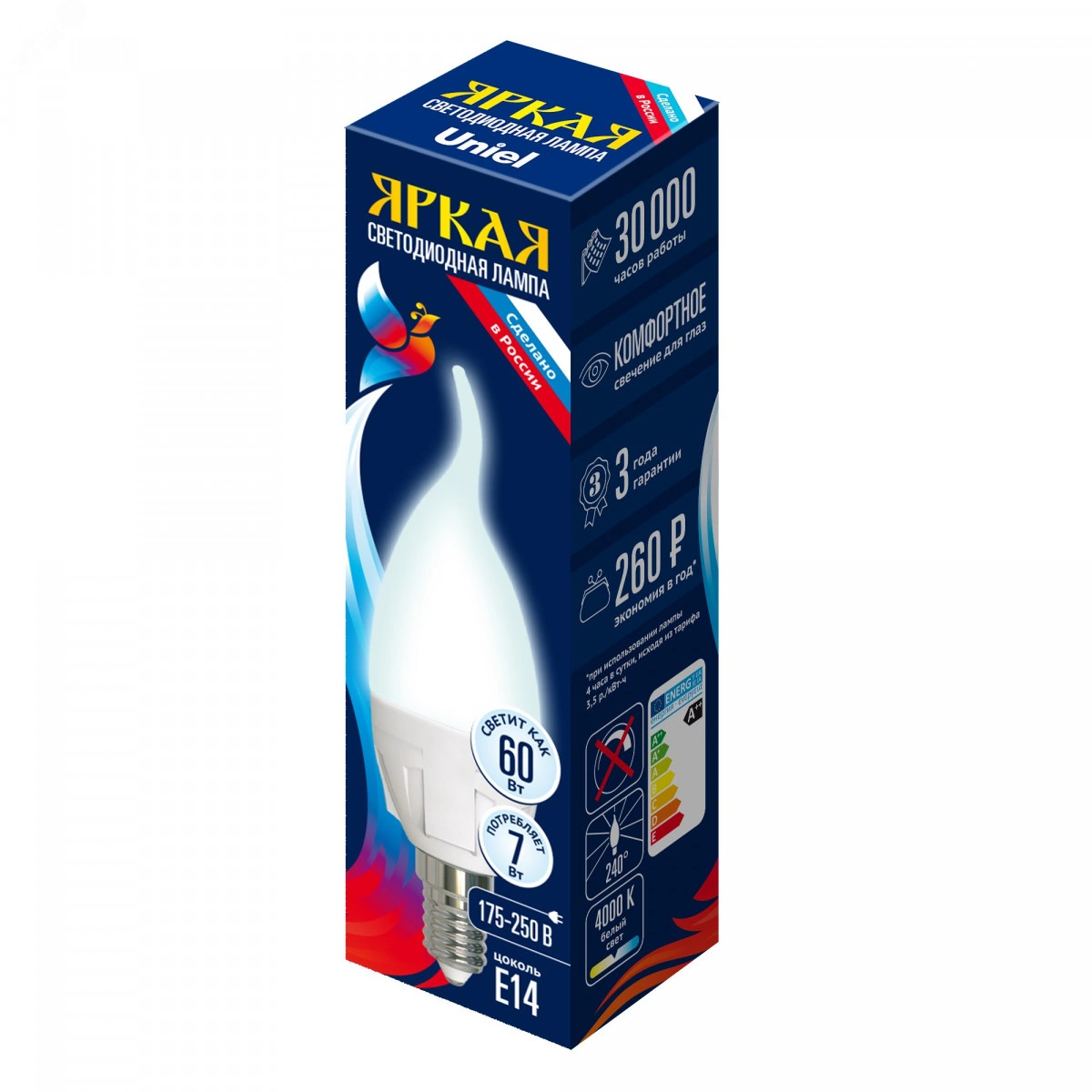 Лампа светодиодная LED 7вт 175-250В свеча на ветру матовая 600Лм Е14 4000К Uniel ЯРКАЯ