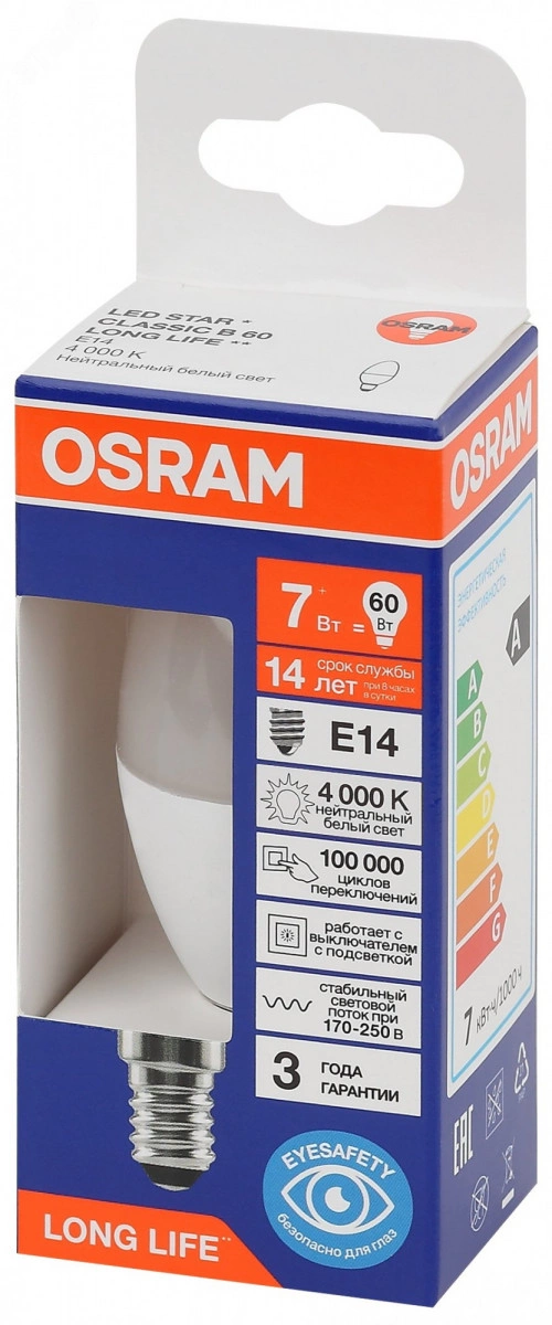 Светодиодные лампы OSRAM LONG LIFE - разумная замена галогенным и традиционным лампам накаливания. Специальная серия OSRAM LONG LIFE снижает затраты на освещение до 90%, сохраненяя привычный и комфортный уровень освещенности. В целях безопасности и с заботой о здоровье потребителей, при производстве не используются вредные вещества согласно материалам европейского стандарта RoHS. Приобретая лампы OSRAM LONG LIFE, вы получаете качество света на высоте - низкие пульсации защищают глаза, высокий индекс цветопередачи позволяет видеть мир в его истинном цвете, отсутствие вредных электромагнитных излучений, что подтверждено сертификатом ЭМС, долгий срок службы в 40 000 часов, 3 года гарантии производителя.