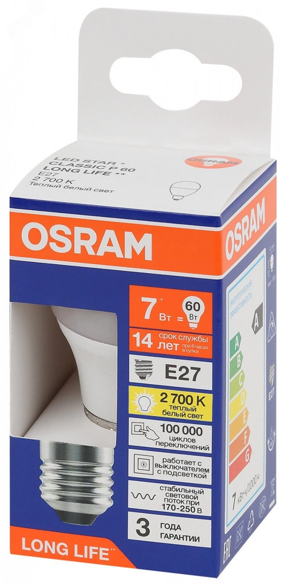 Светодиодные лампы OSRAM LONG LIFE - разумная замена галогенным и традиционным лампам накаливания. Специальная серия OSRAM LONG LIFE снижает затраты на освещение до 90%, сохраненяя привычный и комфортный уровень освещенности. В целях безопасности и с заботой о здоровье потребителей, при производстве не используются вредные вещества согласно материалам европейского стандарта RoHS. Приобретая лампы OSRAM LONG LIFE, вы получаете качество света на высоте - низкие пульсации защищают глаза, высокий индекс цветопередачи позволяет видеть мир в его истинном цвете, отсутствие вредных электромагнитных излучений, что подтверждено сертификатом ЭМС, долгий срок службы в 40 000 часов, 3 года гарантии производителя.