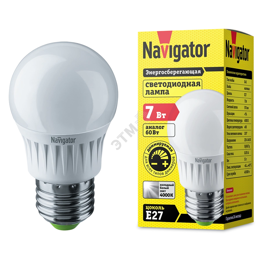 Диммируемые светодиодные лампы Navigator – идеальная замена стандартных ламп накаливания. Данные лампы отличает широкий диапазон диммирования – от 5 до 100 процентов. Они подходят для использования с любыми стандартными диммерами. При производстве ламп используются светодиоды Epistar (Тайвань). Радиатор изготовлен из композитного материала на основе пластика и алюминия, что способствует увеличению срока службы лампы. Угол раскрытия светового луча – 230 градусов. Отсутствуют пульсации светового потока.