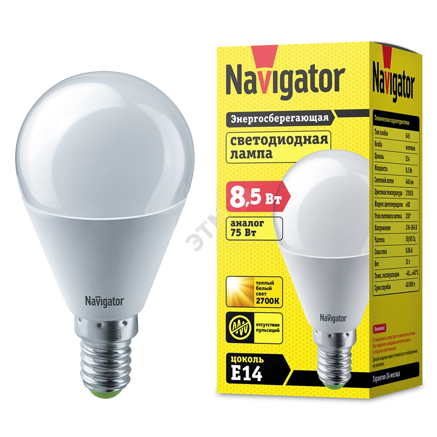 Cветодиодные лампы Navigator – идеальная замена стандартных ламп накаливания. Данные лампы работают в широком диапазоне входного напряжения от 176 до 264 В без снижения яркости. При производстве ламп используются светодиоды Epistar (Тайвань), что обеспечивает высокую эффективность до 100 лм/Вт. Радиатор изготовлен из композитного материала на основе пластика и алюминия, что способствует увеличению срока службы лампы. Угол раскрытия светового луча – 230 градусов. Отсутствуют пульсации светового потока.