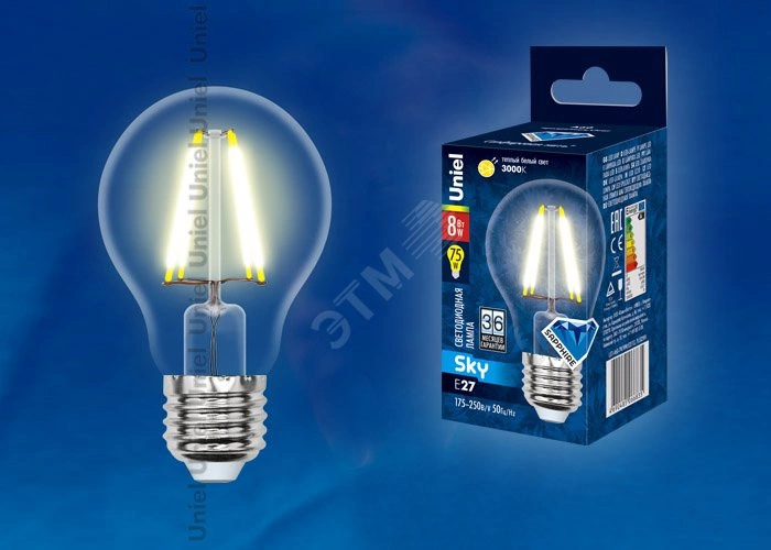 Лампа светодиодная LED 8вт 200-250В форма А прозрачное 800Лм E27 3000К Uniel Sky филамент
