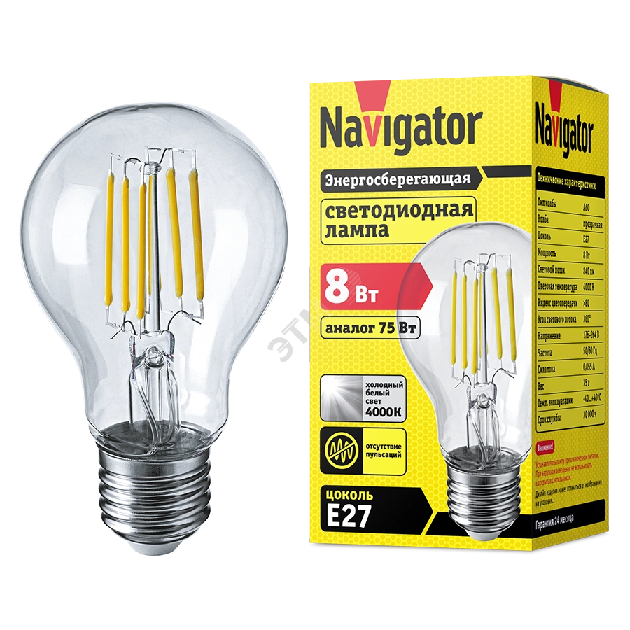 Филаментные лампы Navigator специально созданы для имитации классических ламп накаливания и отлично подойдут для освещения помещений в классическом стиле и стилях «лофт» и «винтаж». Колба лампы выполнена из стекла без пластиковых вставок. При производстве ламп используются светодиоды Cob Filament Epistar (Тайвань). Данные лампы отличает низкий нагрев корпуса - до 45 градусов. Угол раскрытия светового луча – 360 градусов. Отсутствуют пульсации светового потока.