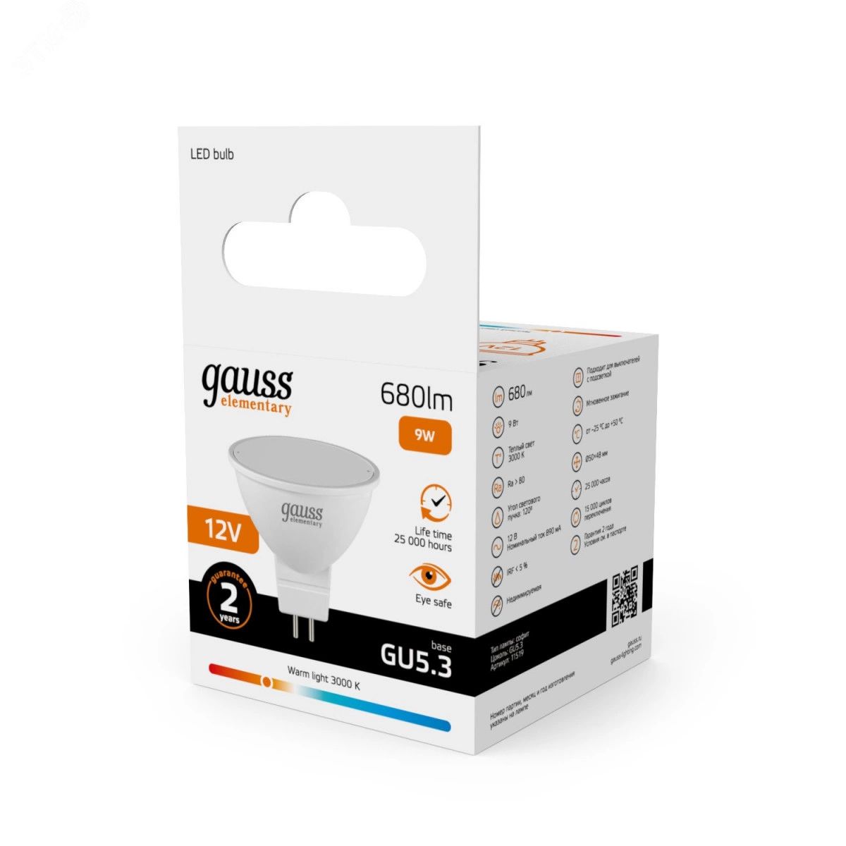 Лампа светодиодная LED 9 Вт 680 лм 3000К DC12В GU5.3 софит MR16 теплая Низковольтная Elementary