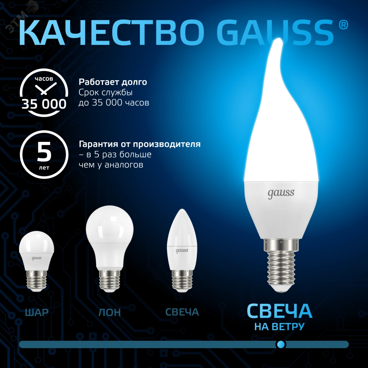 Светодиодные лампы Gauss Candle созданы в форме свечи. Лампы подойдут как для домашнего, так и для коммерческого использования. Такой тип освещения прекрасно смотрится в светильниках без плафонов или устанавливается в люстры и бра. Модель обладает широким диапазоном цветовых температур и мощностей, что поможет создать атмосферу тепла и уюта или концентрации. Равномерный спектр света создает зрительный комфорт в любом помещении. Данный тип освещения от Gauss обеспечивают стабильную работу в течение всего срока службы.