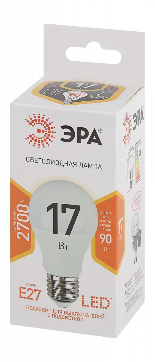 Бытовая светодиодная лампа ЭРА Серии Стандарт, создаёт яркое ровное освещение и экономит до 90% электроэнергии по сравнению с лампой накаливания с аналогичным световым потоком. Светит теплым светом с жёлтым оттенком - такая цветовая температура эффективна для отдыха и уютной атмосферы в доме. Используется в потолочных, настенных, настольных светильниках, в люстрах и бра. Мгновенно включается и не нагревается.