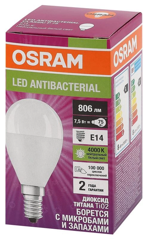 Полное описание: Лампа светодиодная LED Antibacterial 7.5Вт P шар матовая 4000К нейтр. бел. E14 806лм 220-240В угол пучка 180град. бактерицидн. покрыт. (замена 75Вт) OSRAM 4058075561670