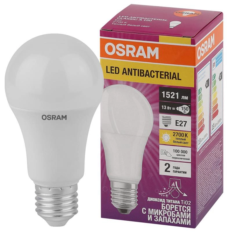 Полное описание: Лампа светодиодная LED Antibacterial A 13Вт грушевидная матовая 2700К тепл. бел. E27 1521лм 220-240В угол пучка 200град. бактерицидн. покрыт. (замена 150Вт) OSRAM 4058075561175