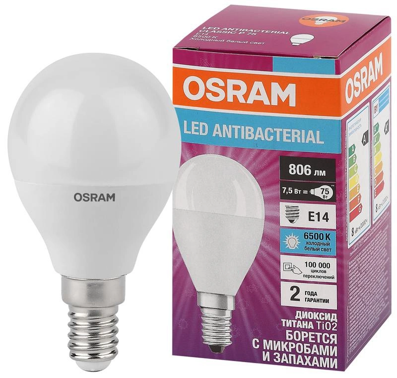 Полное описание: Лампа светодиодная LED Antibacterial P 7.5Вт шар матовая 6500К холод. бел. E14 806лм 220-240В угол пучка 180град. бактерицидн. покрыт. (замена 75Вт) OSRAM 4058075561694