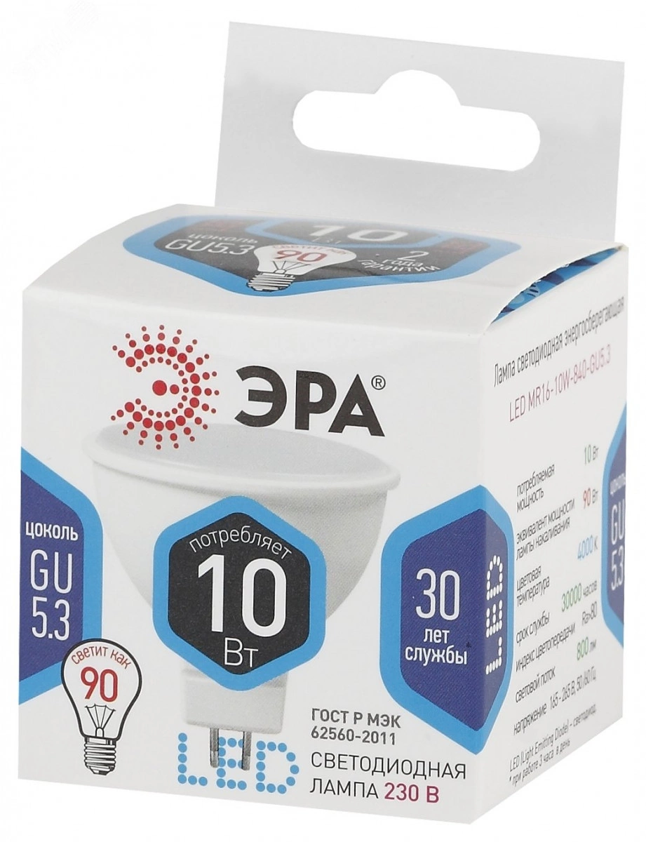 Лампа светодиодная LED MR16-10W-840-GU5.3 (диод, софит, 10Вт, нейтр, GU5.3) ЭРА (10/100/4000) ЭРА