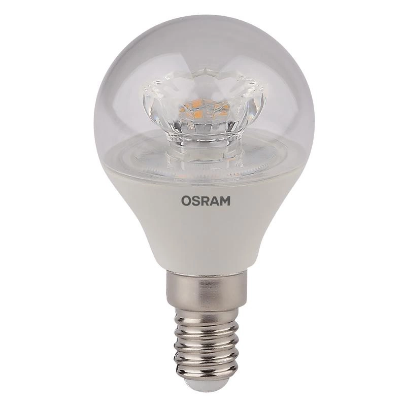 Лампа светодиодная LED CLASSIC P 40 5.4W/830 230V CL E14 OSRAM 4052899971622 – лампа с прозрачной колбой, белого света, длиной 78 мм, диаметром 45 мм, с цоколем Е14, мощностью 5,4 Вт. Цветовая температура 3000 К.